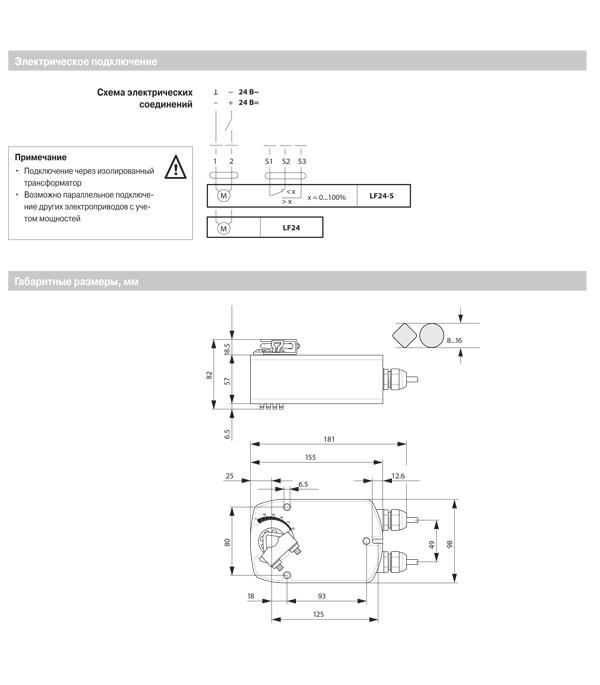 Время срабатывания пружины составляет до 20 сек. Электропривод работает от сети 24 В.