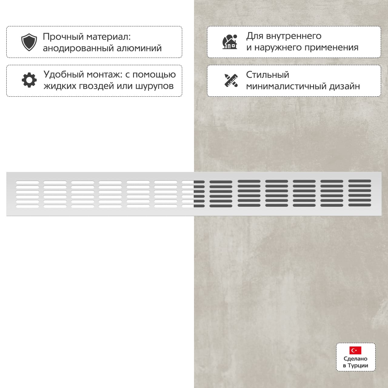 Прямоугольная вентиляционная решетка изготовлена из анодированного алюминия.