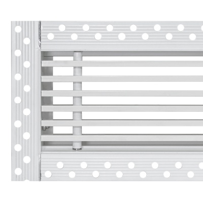 Данная решетка подходит для монтажа на любую поверхность под финишную отделку. Рамка и экран изготовлены из алюминия, опора экрана - из оцинкованной стали. Рама оснащена «полкой» 1,9 мм и рифлеными краями для большей адгезии финишного материала – шпатлевки, цемента. Решетка имеет съемную центральную часть с фиксированным углом наклона ламелей 0°. Она крепится к корпусу прочными металлическими тросиками, легко снимается для очистки и удобного обслуживания.