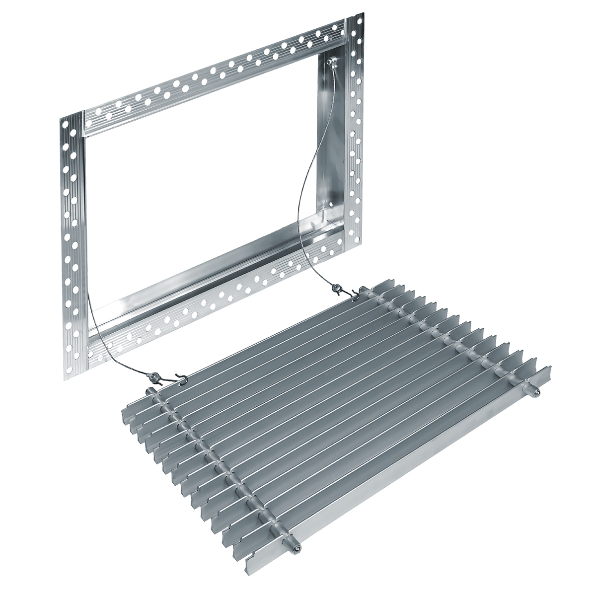 Данная решетка подходит для монтажа на любую поверхность под финишную отделку. Рамка и экран изготовлены из алюминия, опора экрана - из оцинкованной стали. Рама оснащена «полкой» 1,9 мм и рифлеными краями для большей адгезии финишного материала – шпатлевки, цемента. Решетка имеет съемную центральную часть с фиксированным углом наклона ламелей 0°. Она крепится к корпусу прочными металлическими тросиками, легко снимается для очистки и удобного обслуживания.