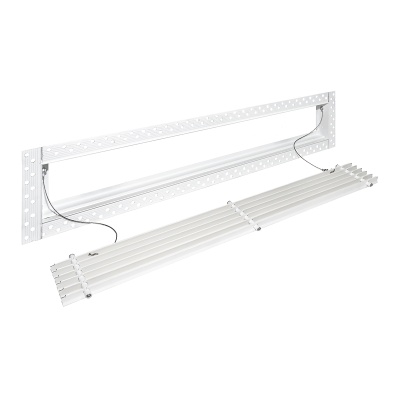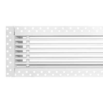 Данная решетка подходит для монтажа на любую поверхность под финишную отделку. Рамка и экран изготовлены из алюминия, опора экрана - из оцинкованной стали. Рама оснащена «полкой» 1,9 мм и рифлеными краями для большей адгезии финишного материала – шпатлевки, цемента. Решетка имеет съемную центральную часть с фиксированным углом наклона ламелей 0°. Она крепится к корпусу прочными металлическими тросиками, легко снимается для очистки и удобного обслуживания.