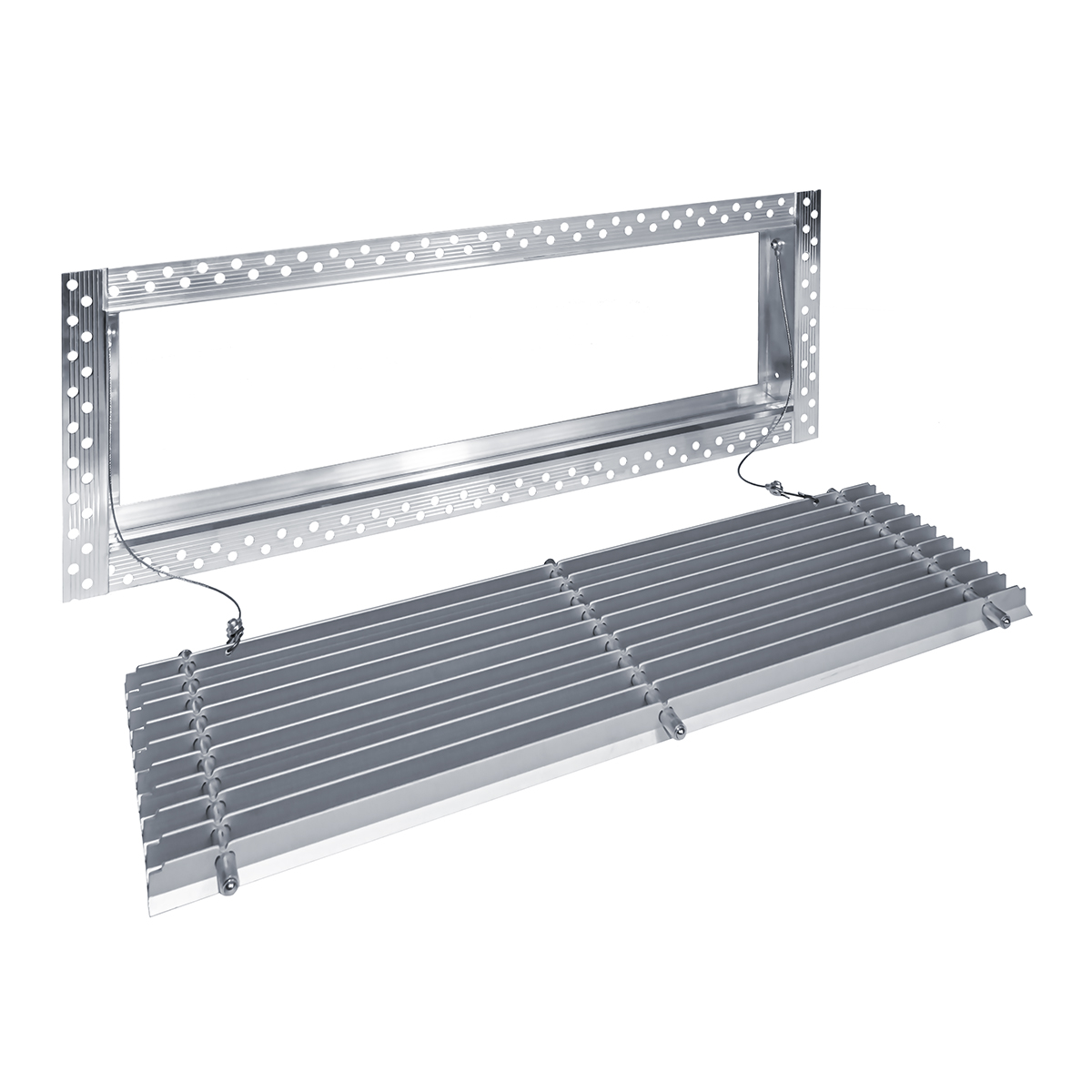 Данная решетка подходит для монтажа на любую поверхность под финишную отделку. Рамка и экран изготовлены из алюминия, опора экрана - из оцинкованной стали. Рама оснащена «полкой» 1,9 мм и рифлеными краями для большей адгезии финишного материала – шпатлевки, цемента. Решетка имеет съемную центральную часть с фиксированным углом наклона ламелей 15°. Она крепится к корпусу прочными металлическими тросиками, легко снимается для очистки и удобного обслуживания.