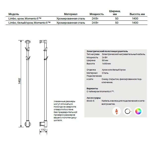 Limbo Momento II - уникальный полотенцесушитель с таймером. Нагрев осуществляется электрическим нагревательным кабелем. Управление полотенцесушителем может осуществляться через мобильное приложение Pax Wireless. Ваш полотенцесушитель будет включен только тогда, когда вам это нужно, так что вы можете легко снизить счета за электричество без ущерба для повседневного комфорта.