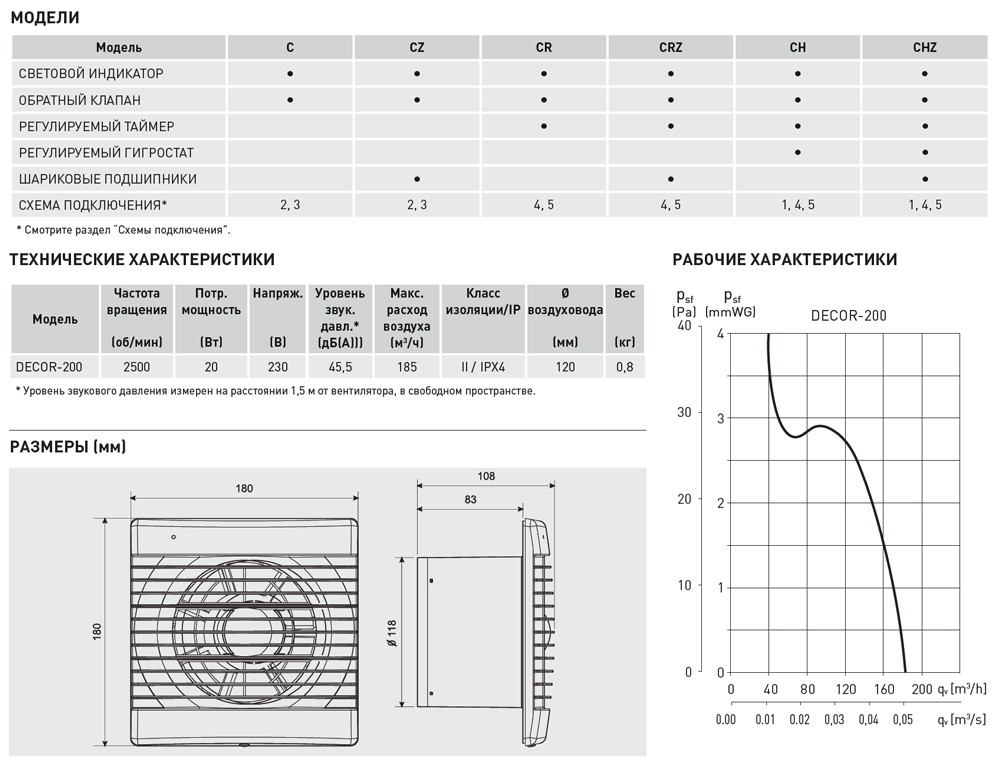 Вентиляторы изготавливаются из высококачественного АБС - пластика, комплектуются световым индикатором работы и однофазным электродвигателем (230В-50Гц), класс изоляции В, со встроенной термозащитой. Данная модель оснащается электродвигателями с повышенным сроком службы, укомплектованными шариковыми подшипниками.
