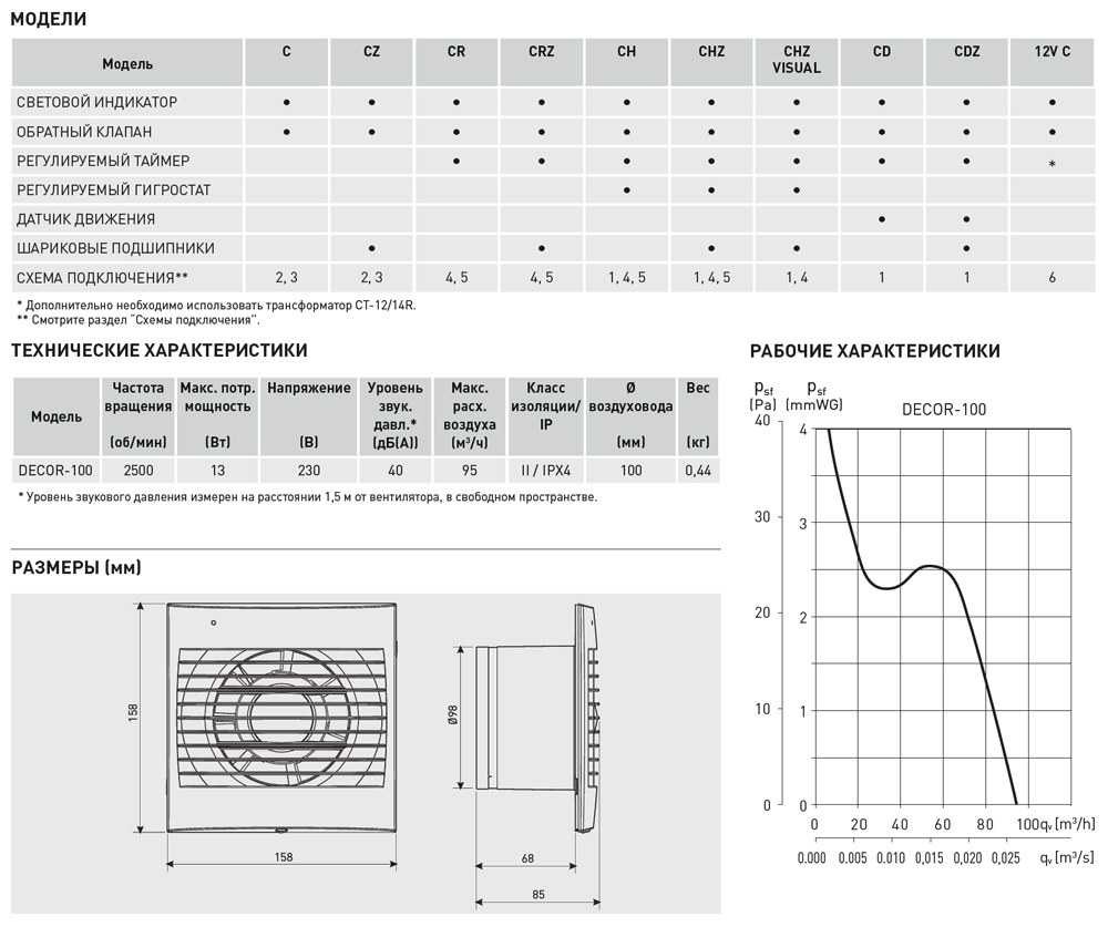 Комплект состоит из вентилятора DECOR-100CZ 12V ECOWATT и внешнего трансформатора CT-12/6 ECOWATT. Модель разработана специально для душевых и ванных комнат. Вентиляторы Décor 12V ECOWATT изготавливаются из высококачественного пластика, комплектуются обратным клапаном и электродвигателем постоянного тока. Такие двигатели обладают низким энергопотреблением и высокой эффективностью. Модель «Z» оснащается электродвигателем с повышенным сроком службы за счет использования шариковых подшипников. Для работы вентилятору требуется понижающий трансформатор CT-12/6 ECOWATT.