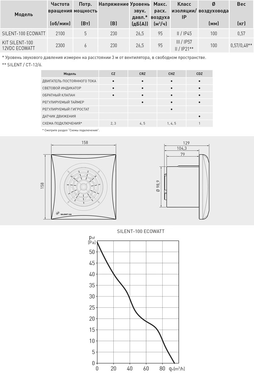 Максимальный расход воздуха составляет 95 м3/ч. Вентиляторы предназначены для присоединения к воздуховодам диаметром 100 мм.
