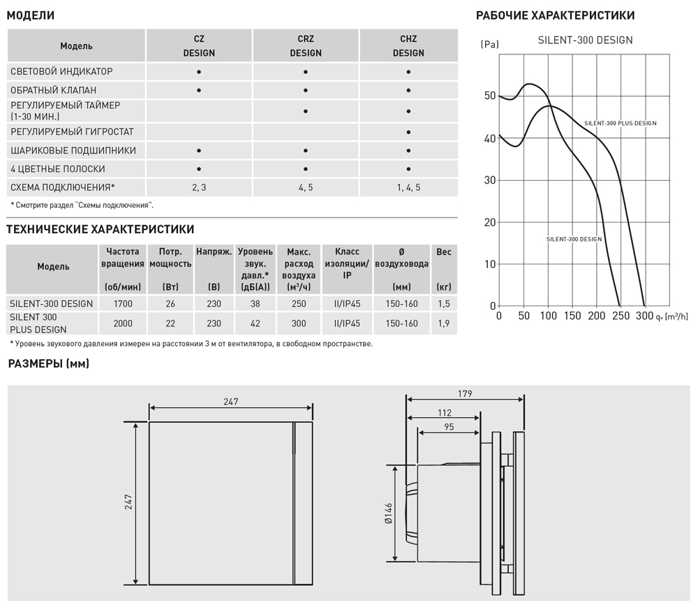 Малошумные вентиляторы SILENT DESIGN имеют II класс электробезопасности, и не требуют заземления, класс защиты IP 45 и рабочую температуру воздуха от 0°С до +40°С.