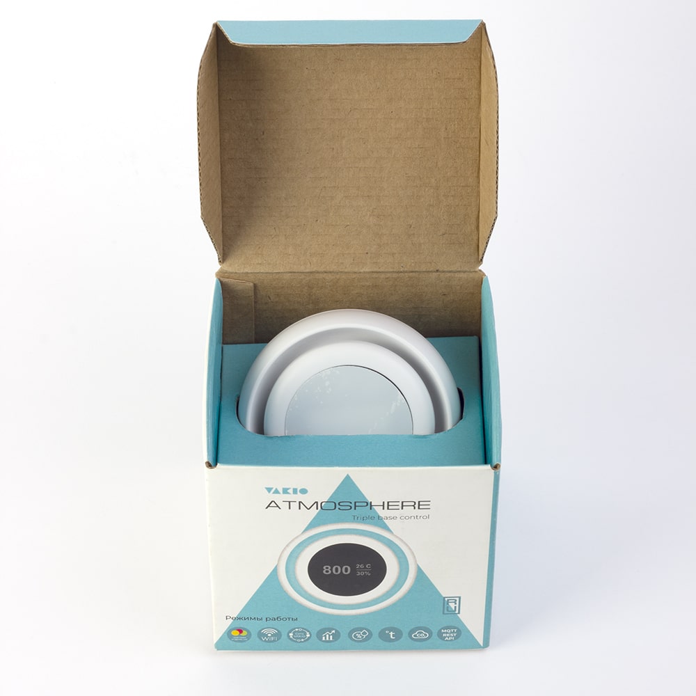 Монитор качества воздуха Vakio ATMOSPHERE - это климатическая станция для измерения температуры, влажности воздуха и уровня углекислого газа. Затем монитор передает эти данные другим устройствам, отвечающим за состояние воздуха в помещении (например, VAKIO Window Smart, Base Smart, OpenAir) и тем самым поддерживает чистоту и температуру воздуха в помещении без вашего участия! Вы можете самостоятельно установить границы, в которых нужно держать показатели воздуха и менять их со своего смартфона с помощью приложения Vakio SMART Control или Яндекс станции Алиса.